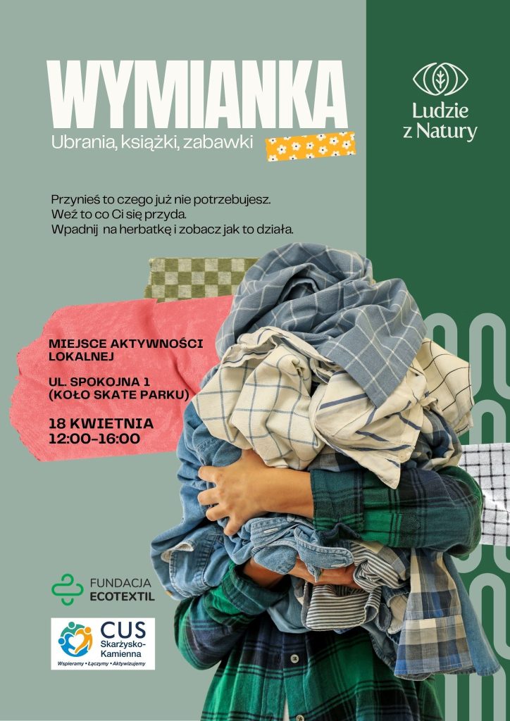 Zapraszamy na wyjątkowe wydarzenie organizowane przez Fundacja Ludzie z Natury przy współpracy z Centrum Usług Społecznych w Skarżysku-Kamiennej i Fundacja Eco Textil! Kiedy? 18 kwietnia (sobota) Godzina: 12:00–16:00 Gdzie?